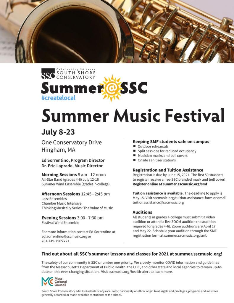 Join me at South Shore Conservatory for an outdoor, socially-distanced Summer Music Festival experience! There’s nothing better than the joy of making music together in person, especially after how isolated we’ve all been during the past year. Musical opportunities are available for students in grade 4 through college, and tuition assistance is available. I hope to see you there!